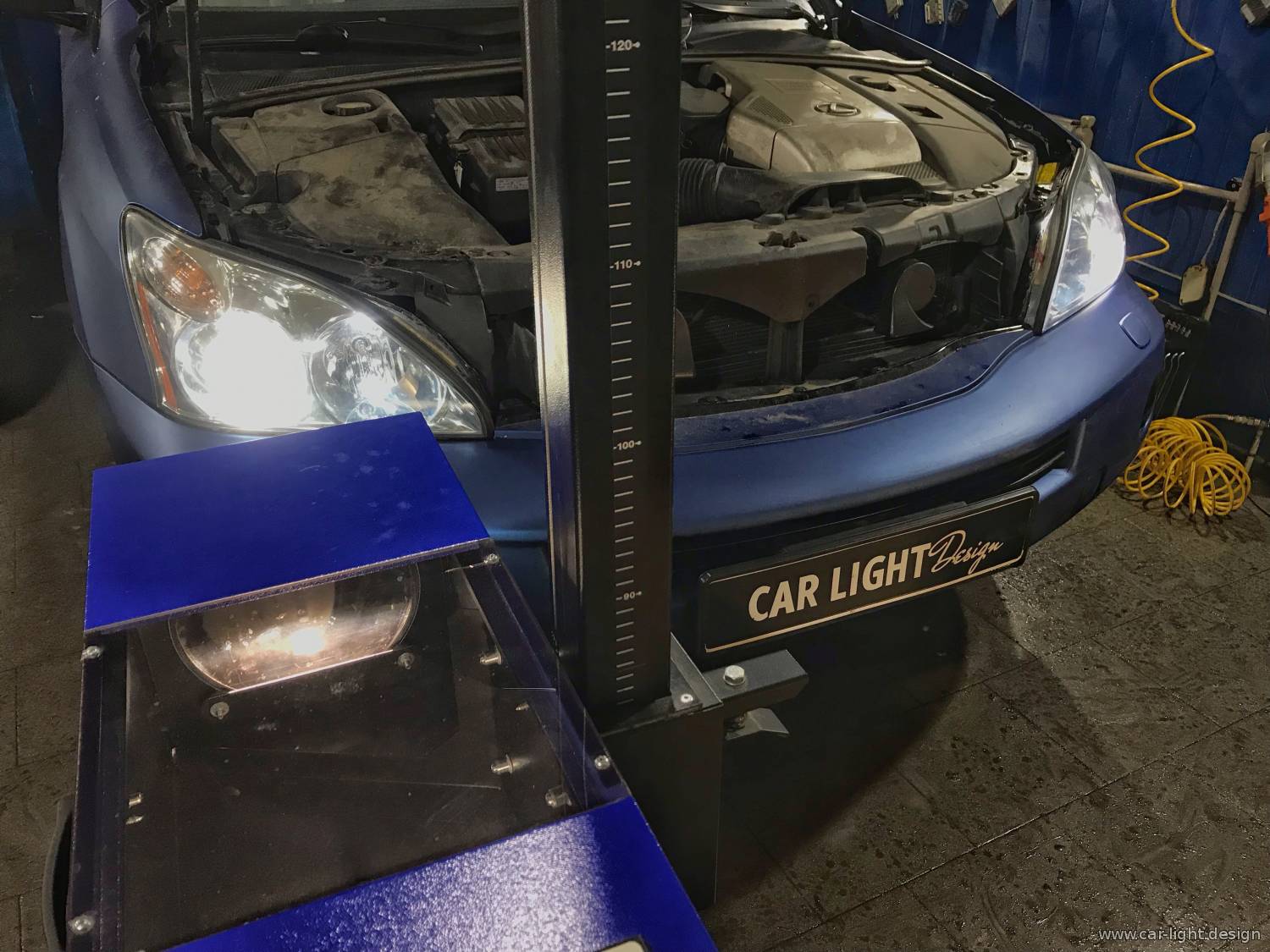 Предстояла еще работа подключения и проверки адаптивного механизма. А также настройки света новых биксеноновых линз на регулировочном стенде. И после того, как адаптивный механизм автомобиля отработал все свой штатный функционал и на приборной панели автомобиля отсутствие ошибок, автомобиль направился на регулировочный стенд, для дальнейшей настройки света новых билинз.